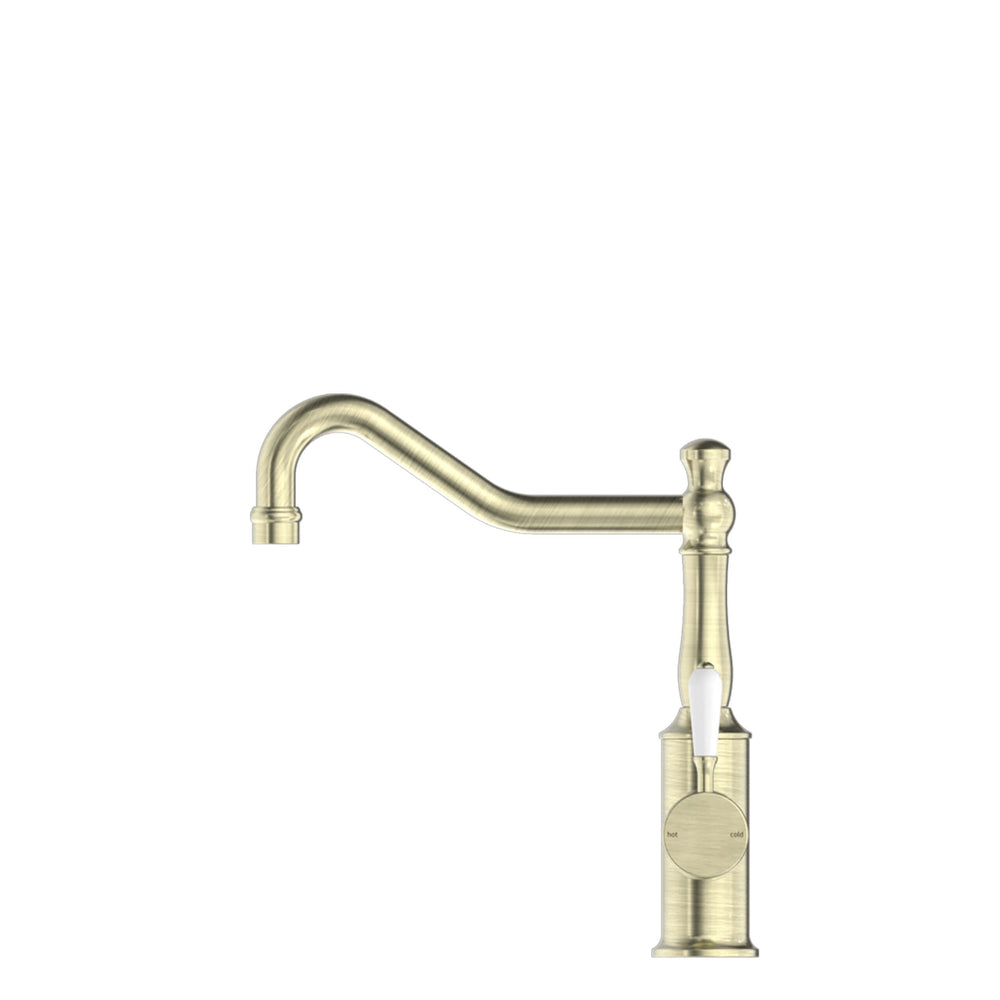 Nero York Kitchen Mixer Hook Spout With White Porcelain Lever Aged Brass