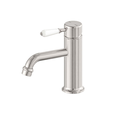 Nero York Straight Basin Mixer With White Porcelain Lever Brushed Nickel